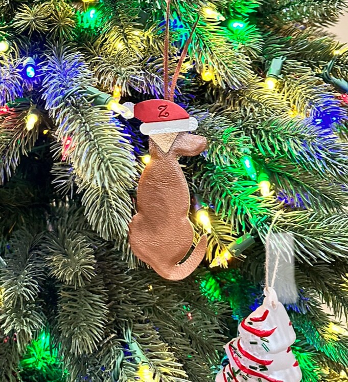 Leather Hungarian Vizsla with Santa Hat - a perfect unique hanging Christmas Decoration. There is no nicer gift to bestow to a Hungarian Vizsla owner than a caricature of their beloved fur baby.